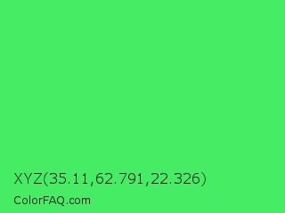 XYZ 35.11,62.791,22.326 Color is a normal green color and the nearest color is UFO Green #3cd070. Hex code #46ed64 and RGB value is rgb(70,237,100). In RGB color space, this color is composed of 27% red, 93% green, 39% blue, In CMYK color space, this color is composed of 70% cyan, 0% magenta, 58% yellow , 7% black , In HSL color space, this color has a hue angle of 131° , 82% saturation and 60% lightness.