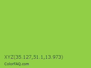 XYZ 35.127,51.1,13.973 Color is a normal green color and the nearest color is Yellow Green #9acd32. Hex code #91cf47 and RGB value is rgb(145,207,71). In RGB color space, this color is composed of 57% red, 81% green, 28% blue, In CMYK color space, this color is composed of 30% cyan, 0% magenta, 66% yellow , 19% black , In HSL color space, this color has a hue angle of 87° , 59% saturation and 55% lightness.