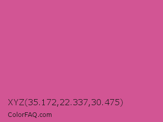 XYZ 35.172,22.337,30.475 Color is a normal rose color and the nearest color is Pink Pantone #d74894. Hex code #d25594 and RGB value is rgb(210,85,148). In RGB color space, this color is composed of 82% red, 33% green, 58% blue, In CMYK color space, this color is composed of 0% cyan, 60% magenta, 30% yellow , 18% black , In HSL color space, this color has a hue angle of 330° , 58% saturation and 58% lightness.