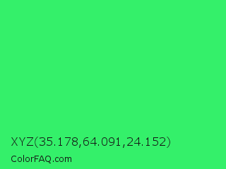XYZ 35.178,64.091,24.152 Color is a normal green color and the nearest color is UFO Green #3cd070. Hex code #34f06a and RGB value is rgb(52,240,106). In RGB color space, this color is composed of 20% red, 94% green, 42% blue, In CMYK color space, this color is composed of 78% cyan, 0% magenta, 56% yellow , 6% black , In HSL color space, this color has a hue angle of 137° , 86% saturation and 57% lightness.