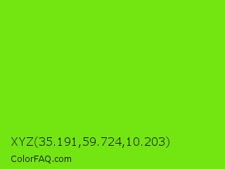 XYZ 35.191,59.724,10.203 Color is a normal green color and the nearest color is Alien Armpit #84de02. Hex code #73e511 and RGB value is rgb(115,229,17). In RGB color space, this color is composed of 45% red, 90% green, 7% blue, In CMYK color space, this color is composed of 50% cyan, 0% magenta, 93% yellow , 10% black , In HSL color space, this color has a hue angle of 92° , 86% saturation and 48% lightness.