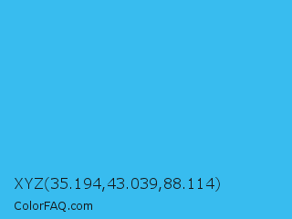 XYZ 35.194,43.039,88.114 Color is a normal blue color and the nearest color is Picton Blue #45b1e8. Hex code #38bcef and RGB value is rgb(56,188,239). In RGB color space, this color is composed of 22% red, 74% green, 94% blue, In CMYK color space, this color is composed of 77% cyan, 21% magenta, 0% yellow , 6% black , In HSL color space, this color has a hue angle of 197° , 85% saturation and 58% lightness.