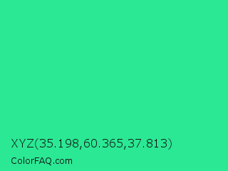 XYZ 35.198,60.365,37.813 Color is a normal green color and the nearest color is Shamrock #33cc99. Hex code #2be894 and RGB value is rgb(43,232,148). In RGB color space, this color is composed of 17% red, 91% green, 58% blue, In CMYK color space, this color is composed of 81% cyan, 0% magenta, 36% yellow , 9% black , In HSL color space, this color has a hue angle of 153° , 80% saturation and 54% lightness.