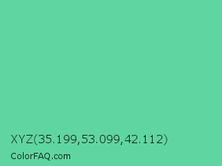XYZ 35.199,53.099,42.112 Color is a light green color and the nearest color is Medium Aquamarine #66ddaa. Hex code #5fd6a1 and RGB value is rgb(95,214,161). In RGB color space, this color is composed of 37% red, 84% green, 63% blue, In CMYK color space, this color is composed of 56% cyan, 0% magenta, 25% yellow , 16% black , In HSL color space, this color has a hue angle of 153° , 59% saturation and 61% lightness.