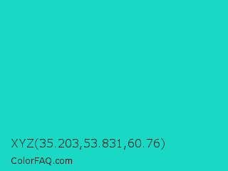 XYZ 35.203,53.831,60.76 Color is a normal cyan color and the nearest color is Turquoise PWG #30d5c8. Hex code #1ad9c4 and RGB value is rgb(26,217,196). In RGB color space, this color is composed of 10% red, 85% green, 77% blue, In CMYK color space, this color is composed of 88% cyan, 0% magenta, 10% yellow , 15% black , In HSL color space, this color has a hue angle of 173° , 79% saturation and 48% lightness.