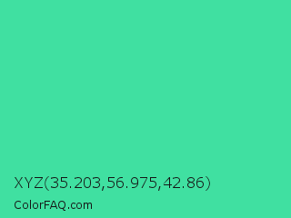 XYZ 35.203,56.975,42.86 Color is a normal green color and the nearest color is Eucalyptus #44d7a8. Hex code #40e0a1 and RGB value is rgb(64,224,161). In RGB color space, this color is composed of 25% red, 88% green, 63% blue, In CMYK color space, this color is composed of 71% cyan, 0% magenta, 28% yellow , 12% black , In HSL color space, this color has a hue angle of 156° , 72% saturation and 56% lightness.
