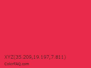 XYZ 35.209,19.197,7.811 Color is a normal red color and the nearest color is Amaranth #e52b50. Hex code #e82947 and RGB value is rgb(232,41,71). In RGB color space, this color is composed of 91% red, 16% green, 28% blue, In CMYK color space, this color is composed of 0% cyan, 82% magenta, 69% yellow , 9% black , In HSL color space, this color has a hue angle of 351° , 81% saturation and 54% lightness.