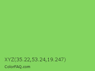 XYZ 35.22,53.24,19.247 Color is a normal green color and the nearest color is Mantis #74c365. Hex code #83d55f and RGB value is rgb(131,213,95). In RGB color space, this color is composed of 51% red, 84% green, 37% blue, In CMYK color space, this color is composed of 38% cyan, 0% magenta, 55% yellow , 16% black , In HSL color space, this color has a hue angle of 102° , 58% saturation and 60% lightness.