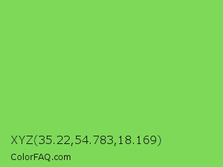 XYZ 35.22,54.783,18.169 Color is a normal green color and the nearest color is Mantis #74c365. Hex code #7ed959 and RGB value is rgb(126,217,89). In RGB color space, this color is composed of 49% red, 85% green, 35% blue, In CMYK color space, this color is composed of 42% cyan, 0% magenta, 59% yellow , 15% black , In HSL color space, this color has a hue angle of 103° , 63% saturation and 60% lightness.