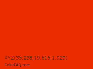 XYZ 35.238,19.616,1.929 Color is a normal red color and the nearest color is Ferrari Red #ff2800. Hex code #eb2e00 and RGB value is rgb(235,46,0). In RGB color space, this color is composed of 92% red, 18% green, 0% blue, In CMYK color space, this color is composed of 0% cyan, 80% magenta, 100% yellow , 8% black , In HSL color space, this color has a hue angle of 12° , 100% saturation and 46% lightness.