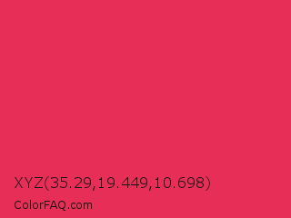 XYZ 35.29,19.449,10.698 Color is a normal red color and the nearest color is Amaranth #e52b50. Hex code #e62e56 and RGB value is rgb(230,46,86). In RGB color space, this color is composed of 90% red, 18% green, 34% blue, In CMYK color space, this color is composed of 0% cyan, 80% magenta, 63% yellow , 10% black , In HSL color space, this color has a hue angle of 347° , 79% saturation and 54% lightness.