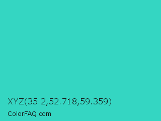 XYZ 35.2,52.718,59.359 Color is a normal cyan color and the nearest color is Turquoise PWG #30d5c8. Hex code #34d6c2 and RGB value is rgb(52,214,194). In RGB color space, this color is composed of 20% red, 84% green, 76% blue, In CMYK color space, this color is composed of 76% cyan, 0% magenta, 9% yellow , 16% black , In HSL color space, this color has a hue angle of 173° , 66% saturation and 52% lightness.