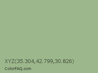 XYZ 35.304,42.799,30.826 Color is a light green color and the nearest color is Dark Sea Green #8fbc8f. Hex code #9cb78b and RGB value is rgb(156,183,139). In RGB color space, this color is composed of 61% red, 72% green, 55% blue, In CMYK color space, this color is composed of 15% cyan, 0% magenta, 24% yellow , 28% black , In HSL color space, this color has a hue angle of 97° , 23% saturation and 63% lightness.