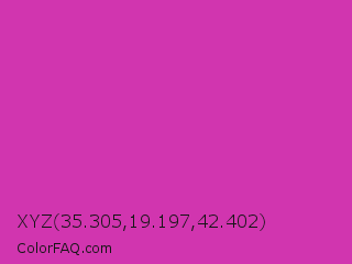 XYZ 35.305,19.197,42.402 Color is a normal magenta color and the nearest color is Byzantine #bd33a4. Hex code #d135af and RGB value is rgb(209,53,175). In RGB color space, this color is composed of 82% red, 21% green, 69% blue, In CMYK color space, this color is composed of 0% cyan, 75% magenta, 16% yellow , 18% black , In HSL color space, this color has a hue angle of 313° , 63% saturation and 51% lightness.
