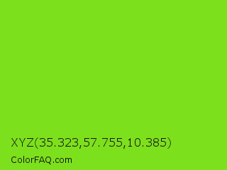 XYZ 35.323,57.755,10.385 Color is a normal green color and the nearest color is Alien Armpit #84de02. Hex code #7de01c and RGB value is rgb(125,224,28). In RGB color space, this color is composed of 49% red, 88% green, 11% blue, In CMYK color space, this color is composed of 44% cyan, 0% magenta, 88% yellow , 12% black , In HSL color space, this color has a hue angle of 90° , 78% saturation and 49% lightness.