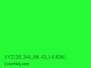 XYZ 35.341,68.43,14.836 Color is a normal green color and the nearest color is Neon Green #39ff14. Hex code #26f936 and RGB value is rgb(38,249,54). In RGB color space, this color is composed of 15% red, 98% green, 21% blue, In CMYK color space, this color is composed of 85% cyan, 0% magenta, 78% yellow , 2% black , In HSL color space, this color has a hue angle of 125° , 95% saturation and 56% lightness.