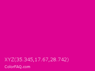 XYZ 35.345,17.67,28.742 Color is a normal magenta color and the nearest color is Mexican Pink #e4007c. Hex code #de0392 and RGB value is rgb(222,3,146). In RGB color space, this color is composed of 87% red, 1% green, 57% blue, In CMYK color space, this color is composed of 0% cyan, 99% magenta, 34% yellow , 13% black , In HSL color space, this color has a hue angle of 321° , 97% saturation and 44% lightness.