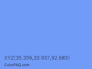 XYZ 35.359,33.937,92.683 Color is a light blue color and the nearest color is Cornflower Blue #6495ed. Hex code #709cf7 and RGB value is rgb(112,156,247). In RGB color space, this color is composed of 44% red, 61% green, 97% blue, In CMYK color space, this color is composed of 55% cyan, 37% magenta, 0% yellow , 3% black , In HSL color space, this color has a hue angle of 220° , 89% saturation and 70% lightness.