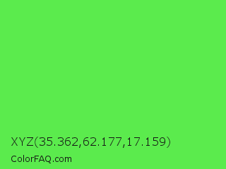 XYZ 35.362,62.177,17.159 Color is a light green color and the nearest color is Screamin Green #66ff66. Hex code #5beb4d and RGB value is rgb(91,235,77). In RGB color space, this color is composed of 36% red, 92% green, 30% blue, In CMYK color space, this color is composed of 61% cyan, 0% magenta, 67% yellow , 8% black , In HSL color space, this color has a hue angle of 115° , 80% saturation and 61% lightness.