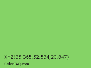 XYZ 35.365,52.534,20.847 Color is a light green color and the nearest color is Pistachio #93c572. Hex code #85d366 and RGB value is rgb(133,211,102). In RGB color space, this color is composed of 52% red, 83% green, 40% blue, In CMYK color space, this color is composed of 37% cyan, 0% magenta, 52% yellow , 17% black , In HSL color space, this color has a hue angle of 103° , 55% saturation and 61% lightness.