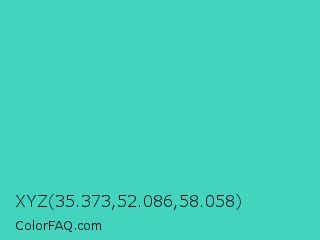 XYZ 35.373,52.086,58.058 Color is a normal cyan color and the nearest color is Medium Turquoise #48d1cc. Hex code #43d4c0 and RGB value is rgb(67,212,192). In RGB color space, this color is composed of 26% red, 83% green, 75% blue, In CMYK color space, this color is composed of 68% cyan, 0% magenta, 9% yellow , 17% black , In HSL color space, this color has a hue angle of 172° , 63% saturation and 55% lightness.