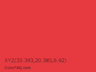 XYZ 35.393,20.385,6.92 Color is a normal red color and the nearest color is Cinnabar #e34234. Hex code #e73a40 and RGB value is rgb(231,58,64). In RGB color space, this color is composed of 91% red, 23% green, 25% blue, In CMYK color space, this color is composed of 0% cyan, 75% magenta, 72% yellow , 9% black , In HSL color space, this color has a hue angle of 358° , 78% saturation and 57% lightness.