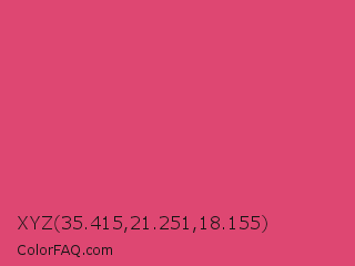 XYZ 35.415,21.251,18.155 Color is a normal rose color and the nearest color is Cabaret #d94972. Hex code #de4772 and RGB value is rgb(222,71,114). In RGB color space, this color is composed of 87% red, 28% green, 45% blue, In CMYK color space, this color is composed of 0% cyan, 68% magenta, 49% yellow , 13% black , In HSL color space, this color has a hue angle of 343° , 70% saturation and 57% lightness.