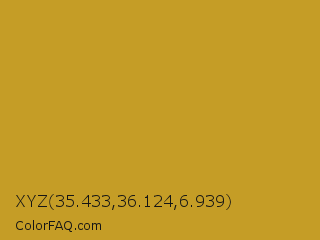 XYZ 35.433,36.124,6.939 Color is a normal orange color and the nearest color is Nugget #c59922. Hex code #c59d26 and RGB value is rgb(197,157,38). In RGB color space, this color is composed of 77% red, 62% green, 15% blue, In CMYK color space, this color is composed of 0% cyan, 20% magenta, 81% yellow , 23% black , In HSL color space, this color has a hue angle of 45° , 68% saturation and 46% lightness.