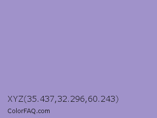 XYZ 35.437,32.296,60.243 Color is a light indigo color and the nearest color is Blue Bell Crayola #9999cc. Hex code #a092ca and RGB value is rgb(160,146,202). In RGB color space, this color is composed of 63% red, 57% green, 79% blue, In CMYK color space, this color is composed of 21% cyan, 28% magenta, 0% yellow , 21% black , In HSL color space, this color has a hue angle of 255° , 35% saturation and 68% lightness.