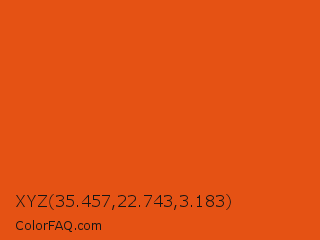 XYZ 35.457,22.743,3.183 Color is a normal orange color and the nearest color is Flame #e25822. Hex code #e55214 and RGB value is rgb(229,82,20). In RGB color space, this color is composed of 90% red, 32% green, 8% blue, In CMYK color space, this color is composed of 0% cyan, 64% magenta, 91% yellow , 10% black , In HSL color space, this color has a hue angle of 18° , 84% saturation and 49% lightness.