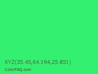 XYZ 35.45,64.194,25.851 Color is a normal green color and the nearest color is UFO Green #3cd070. Hex code #33f070 and RGB value is rgb(51,240,112). In RGB color space, this color is composed of 20% red, 94% green, 44% blue, In CMYK color space, this color is composed of 79% cyan, 0% magenta, 53% yellow , 6% black , In HSL color space, this color has a hue angle of 139° , 86% saturation and 57% lightness.