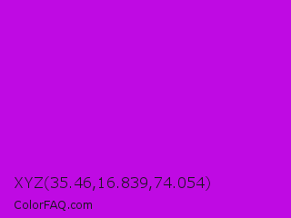 XYZ 35.46,16.839,74.054 Color is a normal purple color and the nearest color is Vivid Mulberry #b80ce3. Hex code #bf0ae3 and RGB value is rgb(191,10,227). In RGB color space, this color is composed of 75% red, 4% green, 89% blue, In CMYK color space, this color is composed of 16% cyan, 96% magenta, 0% yellow , 11% black , In HSL color space, this color has a hue angle of 290° , 92% saturation and 46% lightness.