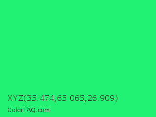 XYZ 35.474,65.065,26.909 Color is a normal green color and the nearest color is Spring Green #00ff7f. Hex code #21f273 and RGB value is rgb(33,242,115). In RGB color space, this color is composed of 13% red, 95% green, 45% blue, In CMYK color space, this color is composed of 86% cyan, 0% magenta, 52% yellow , 5% black , In HSL color space, this color has a hue angle of 144° , 89% saturation and 54% lightness.
