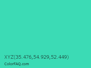 XYZ 35.476,54.929,52.449 Color is a normal cyan color and the nearest color is Eucalyptus #44d7a8. Hex code #3bdbb5 and RGB value is rgb(59,219,181). In RGB color space, this color is composed of 23% red, 86% green, 71% blue, In CMYK color space, this color is composed of 73% cyan, 0% magenta, 17% yellow , 14% black , In HSL color space, this color has a hue angle of 166° , 69% saturation and 55% lightness.