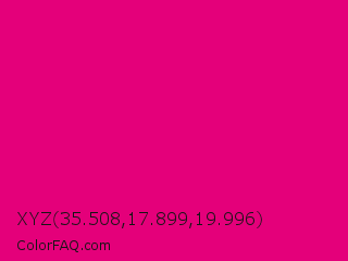 XYZ 35.508,17.899,19.996 Color is a normal rose color and the nearest color is Red Purple #e40078. Hex code #e4007a and RGB value is rgb(228,0,122). In RGB color space, this color is composed of 89% red, 0% green, 48% blue, In CMYK color space, this color is composed of 0% cyan, 100% magenta, 46% yellow , 11% black , In HSL color space, this color has a hue angle of 328° , 100% saturation and 45% lightness.