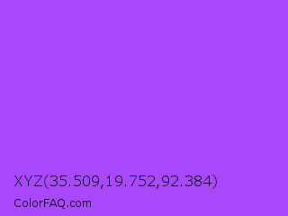 XYZ 35.509,19.752,92.384 Color is a light purple color and the nearest color is Navy Purple #9457eb. Hex code #a748fa and RGB value is rgb(167,72,250). In RGB color space, this color is composed of 65% red, 28% green, 98% blue, In CMYK color space, this color is composed of 33% cyan, 71% magenta, 0% yellow , 2% black , In HSL color space, this color has a hue angle of 272° , 95% saturation and 63% lightness.