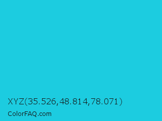 XYZ 35.526,48.814,78.071 Color is a normal cyan color and the nearest color is Scooter #2ebfd4. Hex code #1ccce0 and RGB value is rgb(28,204,224). In RGB color space, this color is composed of 11% red, 80% green, 88% blue, In CMYK color space, this color is composed of 88% cyan, 9% magenta, 0% yellow , 12% black , In HSL color space, this color has a hue angle of 186° , 78% saturation and 49% lightness.