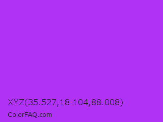 XYZ 35.527,18.104,88.008 Color is a normal purple color and the nearest color is Veronica #a020f0. Hex code #b032f5 and RGB value is rgb(176,50,245). In RGB color space, this color is composed of 69% red, 20% green, 96% blue, In CMYK color space, this color is composed of 28% cyan, 80% magenta, 0% yellow , 4% black , In HSL color space, this color has a hue angle of 279° , 91% saturation and 58% lightness.