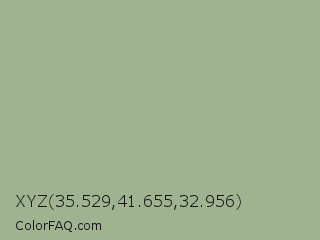 XYZ 35.529,41.655,32.956 Color is a light green color and the nearest color is Locust #a8af8e. Hex code #9fb391 and RGB value is rgb(159,179,145). In RGB color space, this color is composed of 62% red, 70% green, 57% blue, In CMYK color space, this color is composed of 11% cyan, 0% magenta, 19% yellow , 30% black , In HSL color space, this color has a hue angle of 95° , 18% saturation and 64% lightness.