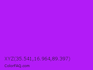 XYZ 35.541,16.964,89.397 Color is a normal purple color and the nearest color is Veronica #a020f0. Hex code #b21bf7 and RGB value is rgb(178,27,247). In RGB color space, this color is composed of 70% red, 11% green, 97% blue, In CMYK color space, this color is composed of 28% cyan, 89% magenta, 0% yellow , 3% black , In HSL color space, this color has a hue angle of 281° , 93% saturation and 54% lightness.