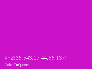XYZ 35.543,17.44,56.137 Color is a normal magenta color and the nearest color is Deep Magenta #cc00cc. Hex code #cc12c8 and RGB value is rgb(204,18,200). In RGB color space, this color is composed of 80% red, 7% green, 78% blue, In CMYK color space, this color is composed of 0% cyan, 91% magenta, 2% yellow , 20% black , In HSL color space, this color has a hue angle of 301° , 84% saturation and 44% lightness.