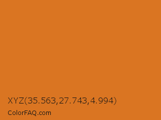 XYZ 35.563,27.743,4.994 Color is a normal orange color and the nearest color is Ochre #cc7722. Hex code #da7522 and RGB value is rgb(218,117,34). In RGB color space, this color is composed of 85% red, 46% green, 13% blue, In CMYK color space, this color is composed of 0% cyan, 46% magenta, 84% yellow , 15% black , In HSL color space, this color has a hue angle of 27° , 73% saturation and 49% lightness.