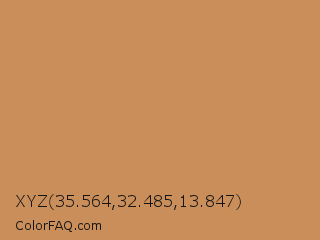 XYZ 35.564,32.485,13.847 Color is a normal orange color and the nearest color is Twine #c2955d. Hex code #c98e59 and RGB value is rgb(201,142,89). In RGB color space, this color is composed of 79% red, 56% green, 35% blue, In CMYK color space, this color is composed of 0% cyan, 29% magenta, 56% yellow , 21% black , In HSL color space, this color has a hue angle of 28° , 51% saturation and 57% lightness.
