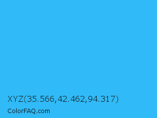 XYZ 35.566,42.462,94.317 Color is a normal blue color and the nearest color is Picton Blue #45b1e8. Hex code #30baf7 and RGB value is rgb(48,186,247). In RGB color space, this color is composed of 19% red, 73% green, 97% blue, In CMYK color space, this color is composed of 81% cyan, 25% magenta, 0% yellow , 3% black , In HSL color space, this color has a hue angle of 198° , 93% saturation and 58% lightness.
