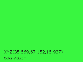 XYZ 35.569,67.152,15.937 Color is a normal green color and the nearest color is Lime Green #32cd32. Hex code #39f640 and RGB value is rgb(57,246,64). In RGB color space, this color is composed of 22% red, 96% green, 25% blue, In CMYK color space, this color is composed of 77% cyan, 0% magenta, 74% yellow , 4% black , In HSL color space, this color has a hue angle of 122° , 91% saturation and 59% lightness.