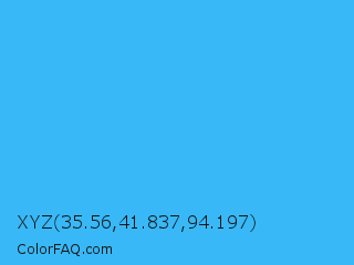 XYZ 35.56,41.837,94.197 Color is a normal blue color and the nearest color is Picton Blue #45b1e8. Hex code #38b8f7 and RGB value is rgb(56,184,247). In RGB color space, this color is composed of 22% red, 72% green, 97% blue, In CMYK color space, this color is composed of 77% cyan, 26% magenta, 0% yellow , 3% black , In HSL color space, this color has a hue angle of 200° , 92% saturation and 59% lightness.