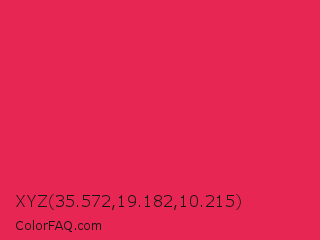 XYZ 35.572,19.182,10.215 Color is a normal red color and the nearest color is Amaranth #e52b50. Hex code #e82654 and RGB value is rgb(232,38,84). In RGB color space, this color is composed of 91% red, 15% green, 33% blue, In CMYK color space, this color is composed of 0% cyan, 84% magenta, 64% yellow , 9% black , In HSL color space, this color has a hue angle of 346° , 81% saturation and 53% lightness.
