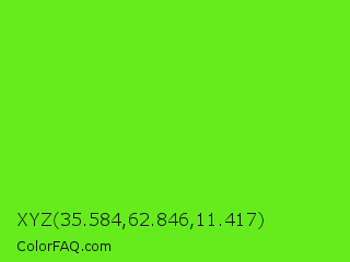 XYZ 35.584,62.846,11.417 Color is a normal green color and the nearest color is Bright Green #66ff00. Hex code #65ec1d and RGB value is rgb(101,236,29). In RGB color space, this color is composed of 40% red, 93% green, 11% blue, In CMYK color space, this color is composed of 57% cyan, 0% magenta, 88% yellow , 7% black , In HSL color space, this color has a hue angle of 99° , 84% saturation and 52% lightness.