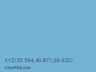 XYZ 35.594,40.877,69.632 Color is a light blue color and the nearest color is Iceberg #71a6d2. Hex code #75b3d6 and RGB value is rgb(117,179,214). In RGB color space, this color is composed of 46% red, 70% green, 84% blue, In CMYK color space, this color is composed of 45% cyan, 16% magenta, 0% yellow , 16% black , In HSL color space, this color has a hue angle of 202° , 54% saturation and 65% lightness.