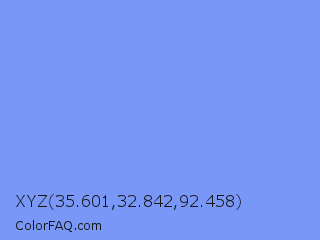 XYZ 35.601,32.842,92.458 Color is a light blue color and the nearest color is Cornflower Blue #6495ed. Hex code #7897f7 and RGB value is rgb(120,151,247). In RGB color space, this color is composed of 47% red, 59% green, 97% blue, In CMYK color space, this color is composed of 51% cyan, 39% magenta, 0% yellow , 3% black , In HSL color space, this color has a hue angle of 225° , 89% saturation and 72% lightness.